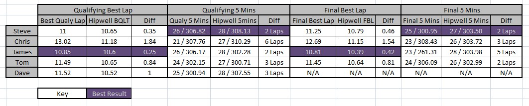 Here is a table showing each team drivers best times. As track conditions changed each week we have compared the times to Matt Hipwell who was very fast and consistent throughout the whole championship.
